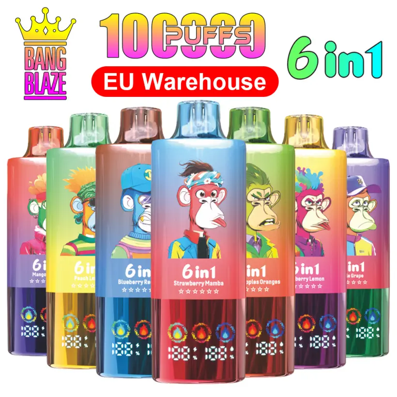 De Bang Blaze 100K Puffs wegwerp vape beschikt over een krachtige 850mAh batterij, een 1,0 ohm mesh coil, Type-C oplaadpoort, LED-scherm en een 6-in-1 ontwerp met 10 smaakopties. Elke doos bevat 10 stuks en elke karton 200 stuks, allemaal verzonden vanuit ons EU-magazijn.