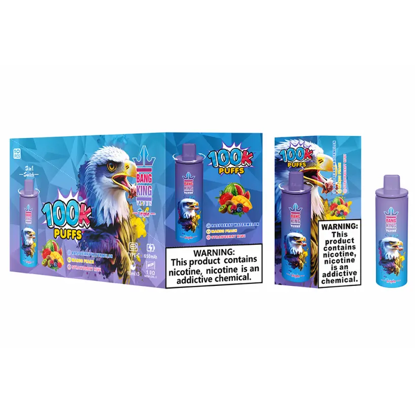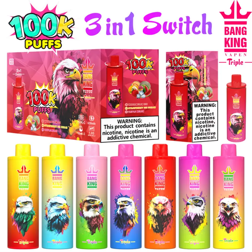 Bang King 100000 Puffs: Ervaar de ultieme wegwerp vape met onze enorme 45ml capaciteit, 650mAh Type-C oplaadbare batterij en slim display. Dit apparaat levert maar liefst 100k puffs met consistente smaak dankzij de 1.0 ohm mesh coil. Kies uit 10 drievoudige smaakopties, elk ontworpen voor maximale voldoening. Geniet van gratis verzending bij groothandelsbestellingen. Standaard verpakking: 10 stuks per doos, 200 per karton. Perfect voor langdurige prestaties en premium vapen.