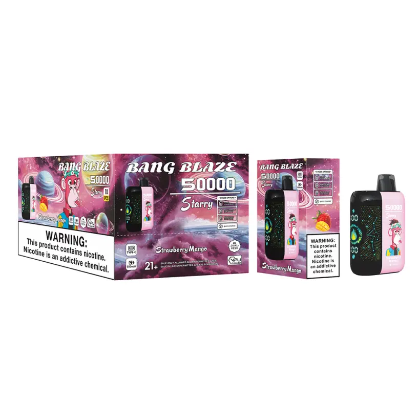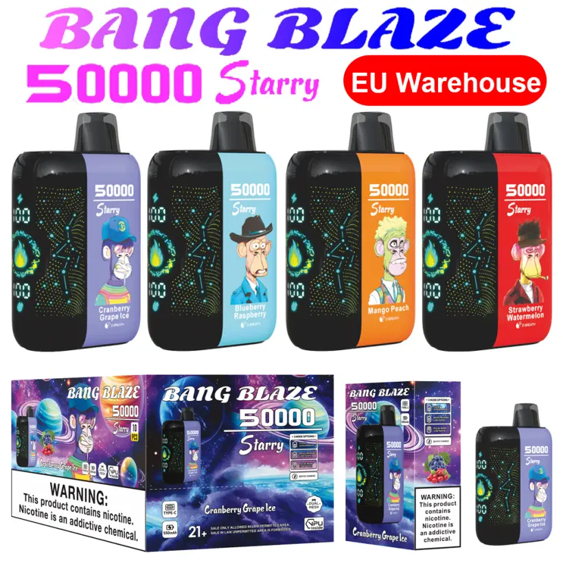De Puff EU Bang Blaze 50000 Puffs wegwerp vape beschikt over een 550mAh batterij, 1,0 ohm mesh coil en Type-C oplaadpoort. Beschikt over 12 populaire smaken. Efficiënte groothandelsverpakking: 10 stuks/doos, 200 stuks/karton. Geniet van betrouwbare prestaties en gratis verzending van deze high-puff wegwerp vape.